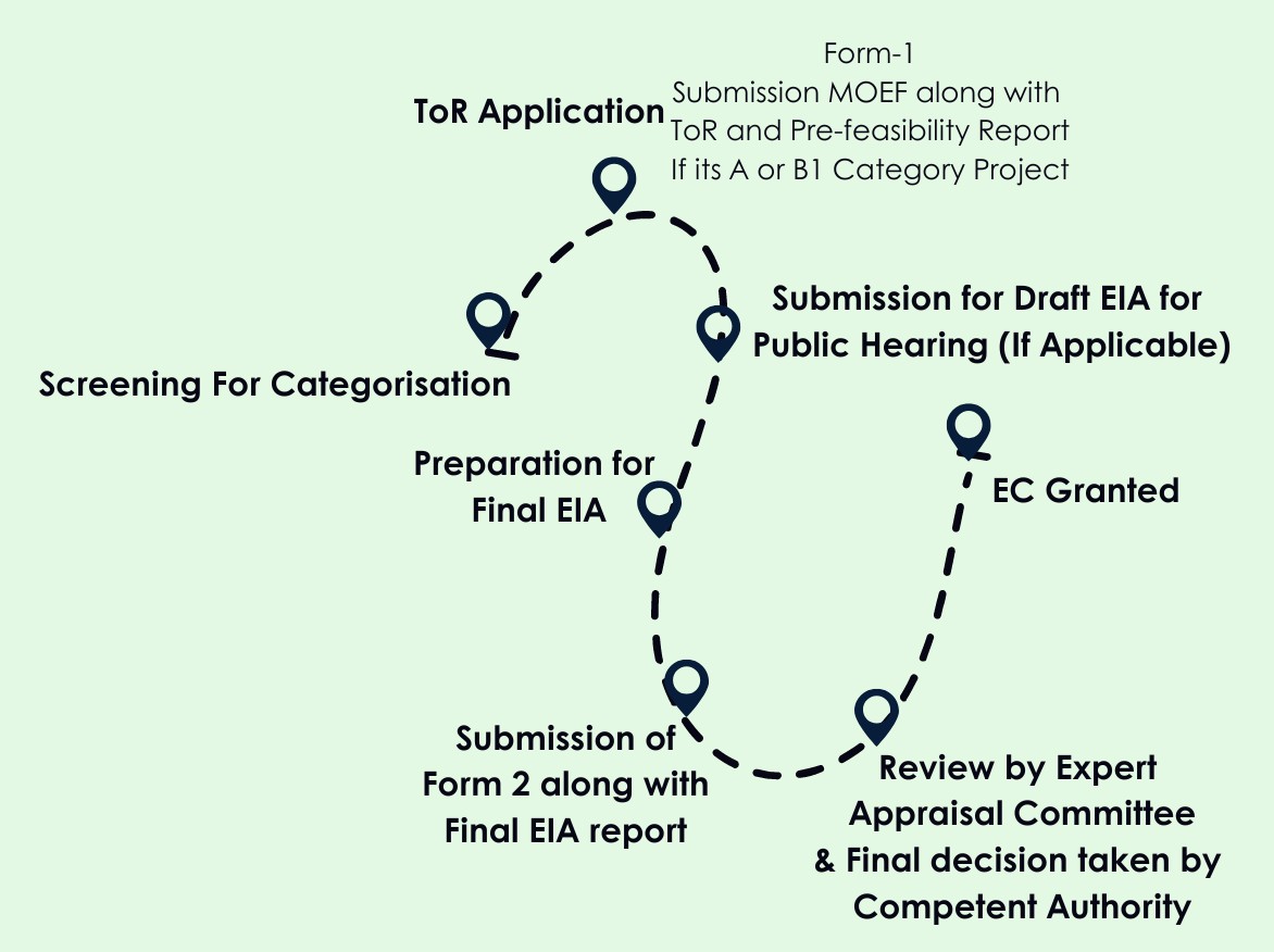 The Ministry of Environment, Forest and Climate Change has issued the Environmental Impact Assessment Notification(2006), which requires prior Environmental Clearance from MoEF & CC, New Delhi for Category A and at SEIAA (State Environmental Impact Assessment Authority) for Category B before the construction work & the projects need certain Environmental Studies, Legal Documentations & approvals.